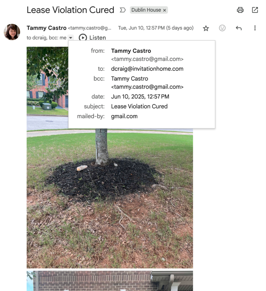 May 25, 2025: We submitted the following photos through the Invitation Homes portal showing that the violation was cured: